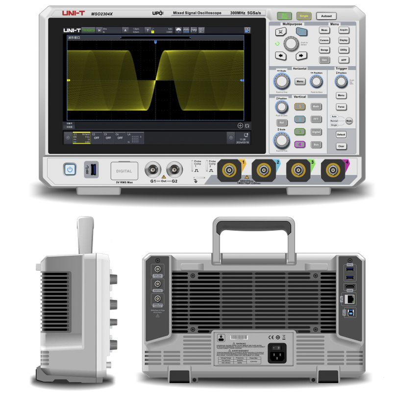 MSO2000X系列混合信号示波器,最大带宽300MHz,采样率最高5GSa/s,具备4个模拟通道和16个数字通道,存储深度可达100Mpts/CH。采用独有的 Ultra Phosphor 3.0技术,波形捕获率高达2,000,000 wfms/s,具有256级辉度等级色温显示,创新的数字触发系统,触发灵敏度高,触发抖动小; 支持丰富的高级触发、串行总线触发和解码;支持频谱分析、电源分析、直方图、波形录制、增强分辨率(ERES)、通过测试、搜索(Search)和导航(Navigate)等高级采集和分析模式;具备丰富的测量和 数学运算功能。采用了 10.1 英寸电容式触摸屏,支持多种手势实现对波形的常用操作,结合前面板的多 个一键操作按键,极大地优化了操作示波器的效率,提升了用户体验。
