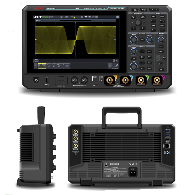 MSO3000X系列混合信号示波器,最大带宽500 MHz,采样率最高5GSa/s,具备4个模拟通道和 16 个数字通道,最大存储深度可达 500Mpts。采用独有的 Ultra Phosphor 3.0技术,波形捕获率高达 2,000,000 wfms/s,具有 256 级辉度等级色温显示,创新的数字触发系统,触发灵敏度高,触发抖动小; 支持丰富的高级触发、串行总线触发和解码;支持频谱分析、电源分析、直方图、波形录制、增强分辨率 (ERES)、硬件加速模板测试、搜索(Search)和导航(Navigate)等高级采集和分析模式;具备丰富 的测量和数学运算功能。采用了 10.1 英寸电容式触摸屏,支持多种手势实现对波形的常用操作,结合前 面板的多个一键操作按键,极大地优化了操作示波器的效率,提升了用户体验。